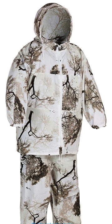 Маскировочный костюм «Метель» одевается поверх тёплой одежды и предназначен для зимней охоты. В этом костюме легко замаскироваться в зимнем лесу и на заснеженном поле. Костюм состоит из куртки «анорак» и брюк. Изготавливается из бязи с водоотталкивающей пропиткой и ацетатного шелка, ткань не шуршит. В солнечный день костюм не будет бликовать и благодаря камуфляжной окраске поможет вам максимально замаскироваться. Куртка костюма застёгивается на молнию, так же есть прорези, для быстрого доступа к карманам одежды. Голову охотника защищает стягиваемый капюшон с фиксатором. В пояс и низ брюк вшита надёжная резинка. В этом костюме вы не будете цепляться за ветки.